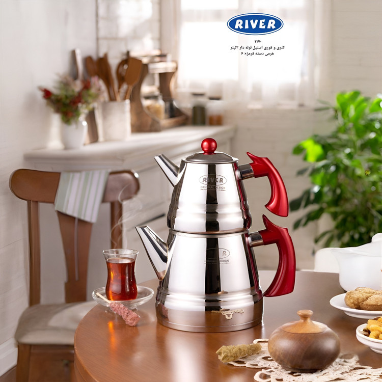 کتری قوری ۳لیتر هرمی لوله ای استیل دسته طرح چوب ریور با طراحی فوق العاده زیبا و کیفیت بالایی که دارد از محصولات پرفروش کالای آشپزخانه برند ریور می باشد. کتری این ست از جنس استیل باکیفیت می باشد که می توانید با خیالی راحت از این سرویس برای سال ها استفاده نمایید.