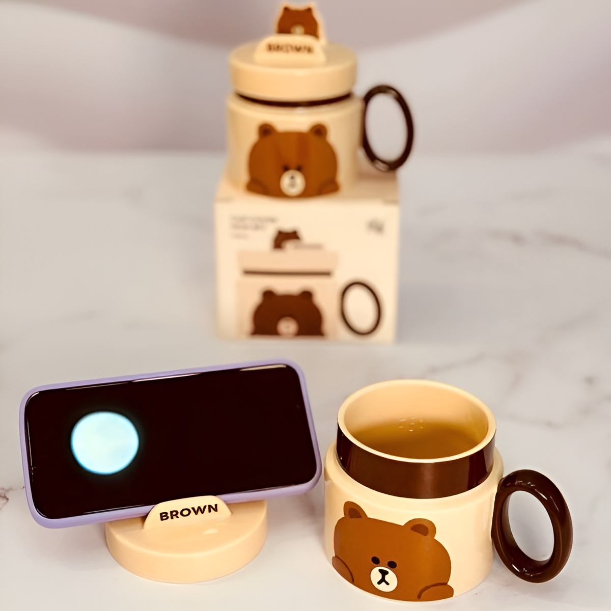 لیوان تدی قهوه‌ای دارای درب سرامیکی و پایه نگهدارنده گوشی