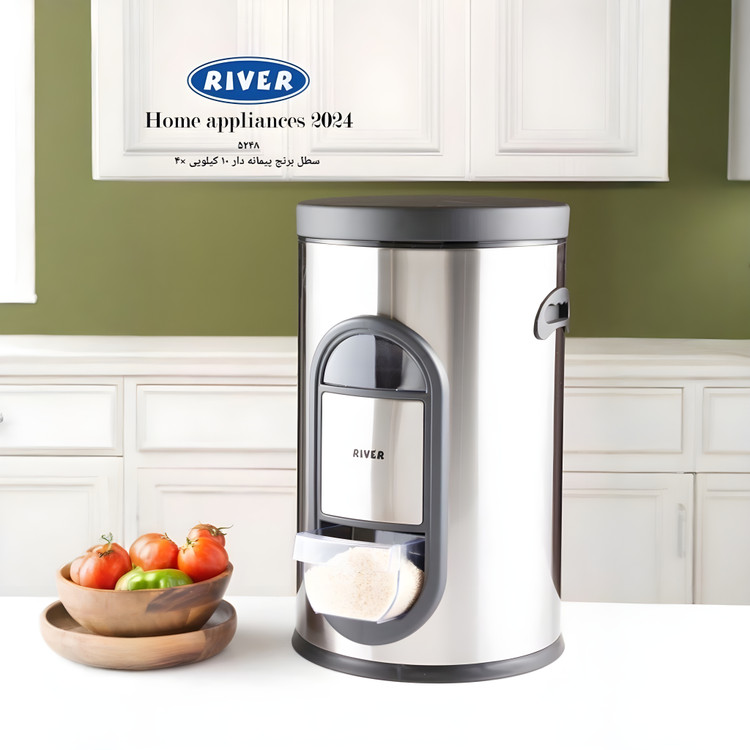 سطل برنج پیمانه دار ۱۰کیلوگرمی ریور دارای بدنه استیل با کیفیت، کاملا مقاوم در برابر رطوبت و شرایط محیطی می باشد. طراحی محفظه و جداره داخلی سطل برنج باعث حفظ دمای مناسب برای نگهداری برنج می شود. در نتیجه این ویژگی باعث می شود بتوان برنج را برای مدت زمان طولانی تری نگهداری کرد.
