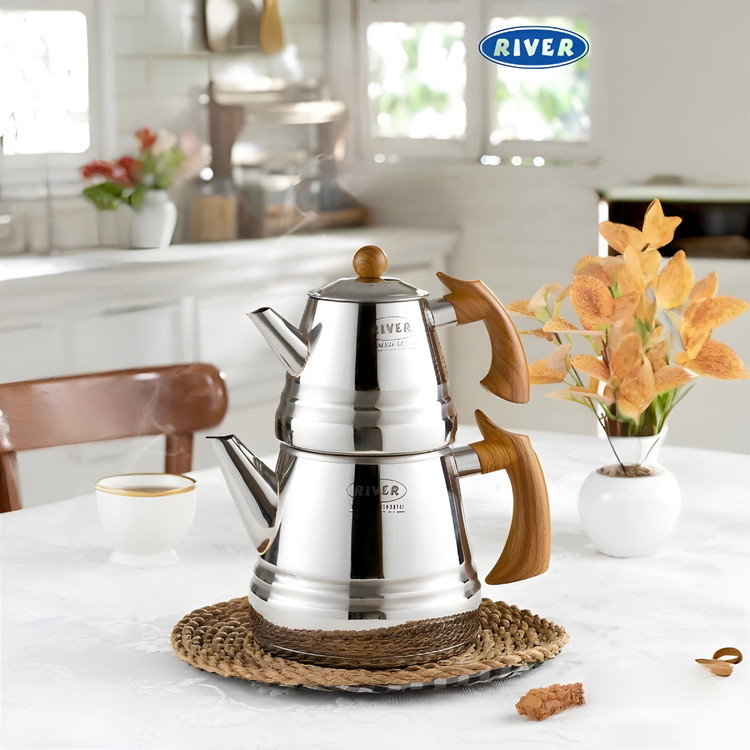 کتری قوری ۳لیتر هرمی لوله ای استیل دسته طرح چوب ریور با طراحی فوق العاده زیبا و کیفیت بالایی که دارد از محصولات پرفروش کالای آشپزخانه برند ریور می باشد. کتری این ست از جنس استیل باکیفیت می باشد که می توانید با خیالی راحت از این سرویس برای سال ها استفاده نمایید.